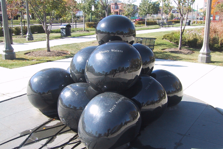 Auburn Park, with its lagoons and stone bridges and fishing ponds, remains one of the South Side's most quietly beautiful green spaces. Renaissance Park, nearby, features a sculptural fountain designed by artist Jerzy Kenar: a pyramid of black granite spheres inscribed with the names of significant African-American figures — Martin Luther King Jr., Rosa Parks, Harold Washington, Maya Angelou. The fountain sends water cascading down the granite in what the artist described as a spring of positive change.