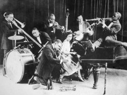 Joe “King” Oliver’s Creole Jazz Band in Chicago, 1923. Honore Dutry (trombone), Baby Dodds (drums), Louis Armstrong (second cornet), King Oliver (cornet), Lil Hardin (piano), Bill Johnson (bass, banjo), and Johnny Dodds (clarinet).