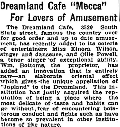 Not only did Billy Bottoms hire Black musicians, entertainers, and service workers, he was considered a prominent African American business owner and community leader in the developing Bronzeville neighborhood who helped create a safe space for his Black clientele to socialize. Called "a first-class resort owned by a member of the Race" by the Chicago Defender, the Dreamland remains an iconic ballroom. Dreamland moved up the street in the mid-1930s before closing in 1946.
