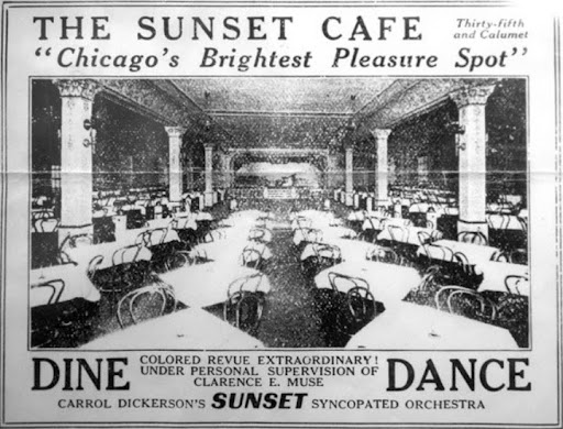 If you stepped into the Sunset Café, you stepped into one of the most important jazz clubs in America, especially during the period between 1917 and 1928 when Chicago became a creative capital of jazz innovation and again during the emergence of bebop in the early 1940s. The Sunset Cafe, also known as The Grand Terrace Cafe or simply Grand Terrace, originally a converted garage, it became a glamorous room filled with tables, a dance floor, and a stage where legends were made. This was where jazz was refined. Where musicians like Louis Armstrong rose into national prominence. Where orchestras were tight, polished, and precise. Where the crowd came dressed to match the moment. And in a rare break from the times, it was known as a “black and tan” club, where Black and white patrons could mingle together. Many important musicians developed their careers at the Sunset/Grand Terrace Cafe.