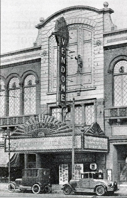The 1,300-seat Vendome Theater opened in 1919 at 3143-49 South State Street to tremendous fanfare in the African American community. Built by O.C. Hammond at a cost of nearly a quarter-million dollars, the theater was luxuriously appointed with marble, gilded plaster, crystal chandeliers, and frescoes, not to mention an expensive and imposing pipe organ. It was a grandiose auditorium, and it catered to black audiences who were denied admission to other neighborhood venues. Leading Hollywood films, as well as “race” films, were shown here, and the theater featured an orchestra led by violinist Erskine Tate, whose band of musicians was amongst the finest in the country. Some came simply to hear the jazz, and the Vendome’s popularity surged when Louis Armstrong joined on cornet in December 1925. The theater’s popularity began to wane by the end of the 1920s, when Tate moved to the Metropolitan Theater and the Regal Theater began drawing away patrons. The building was demolished in 1949.